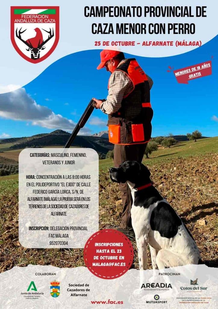 El campeonato malagueño celebrará su trigésimo séptima edición el próximo 25 de octubre en Alfarnate, en terrenos de la Sociedad de Cazadores “Alfarnate”, dentro del coto «Sierra en Medio». La prueba contará con categorías Masculina, Femenina, Veteranos y Junior, y dará comienzo con la concentración de participantes a las 8:00 horas en el Polideportivo El Ejido.