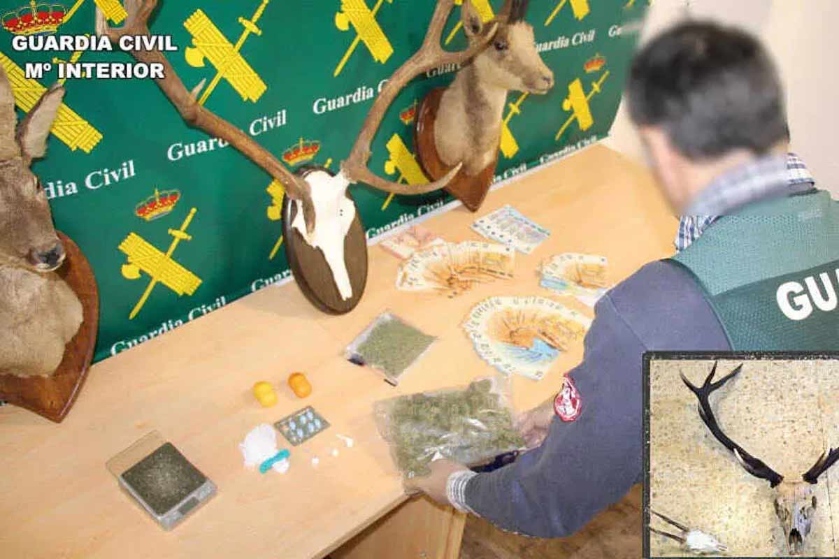 Durante el desarrollo de la operación, los agentes confirmaron sospechas previas relacionadas con la práctica de caza furtiva por parte de algunos de los investigados. En los registros se localizaron dos cabezas disecadas de rebeco y corzo, así como un cráneo con cornamenta de venado, de los que los implicados no pudieron acreditar su procedencia legal. Junto a estos trofeos se halló abundante munición, que también fue intervenida.