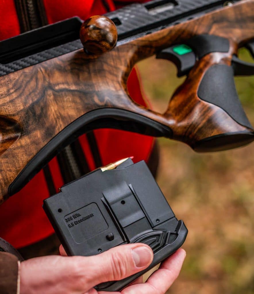 A esta solución se suma un sistema de alimentación poco habitual en rifles de caza: el cargador se introduce por la parte trasera, a través de la culata. Esta arquitectura desplaza el centro de gravedad hacia el cuerpo del tirador, mejorando el equilibrio general y facilitando un encare rápido y natural.